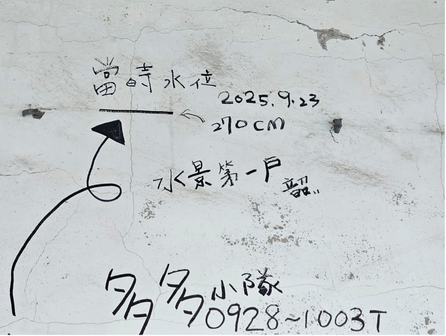 當地居民表示,她目前暫時借住於親友提供的空間,而原本位於路口的家雖然外牆仍在,但屋內已被泥水淹至無法居住,家具全毀,門窗也在災後清理中拆除。她坦言,日常生活需要逐步重建,雖過程艱難,但仍盡力保持樂觀。牆上以簡筆寫下的「水景第一戶」字樣,更呈現居民以幽默面對困境的態度。