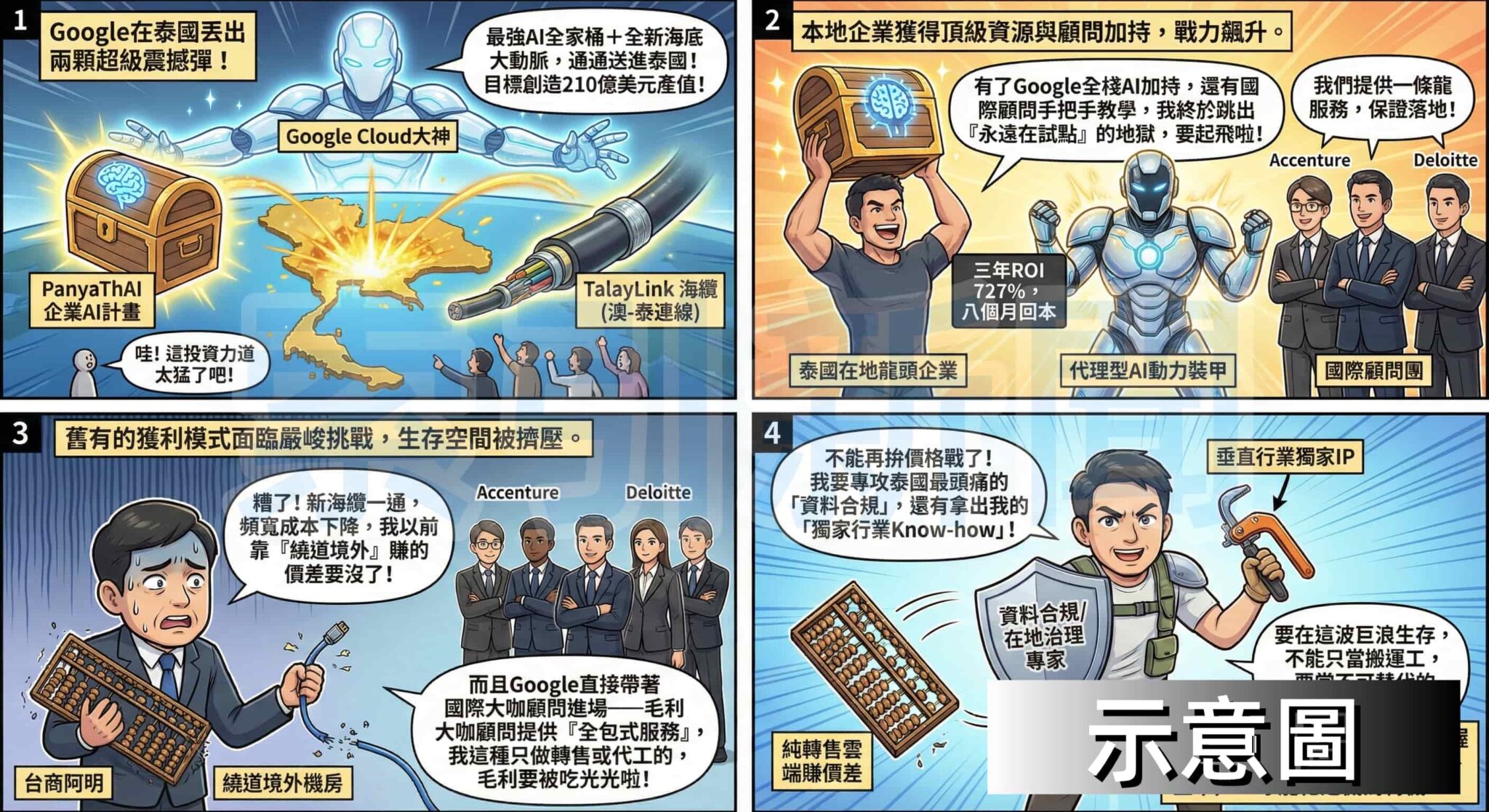 - 雲端轉售與系統整合毛利恐被 Google 生態吃掉一部分:PanyaThAI 主打「全棧+訓練+在地顧問」,等於 Google 直接帶著 Accenture、Deloitte、NTT Data 等 SI 一起進場。台商若只是 resell 雲資源而缺乏垂直場景 IP,議價能力會被削弱。