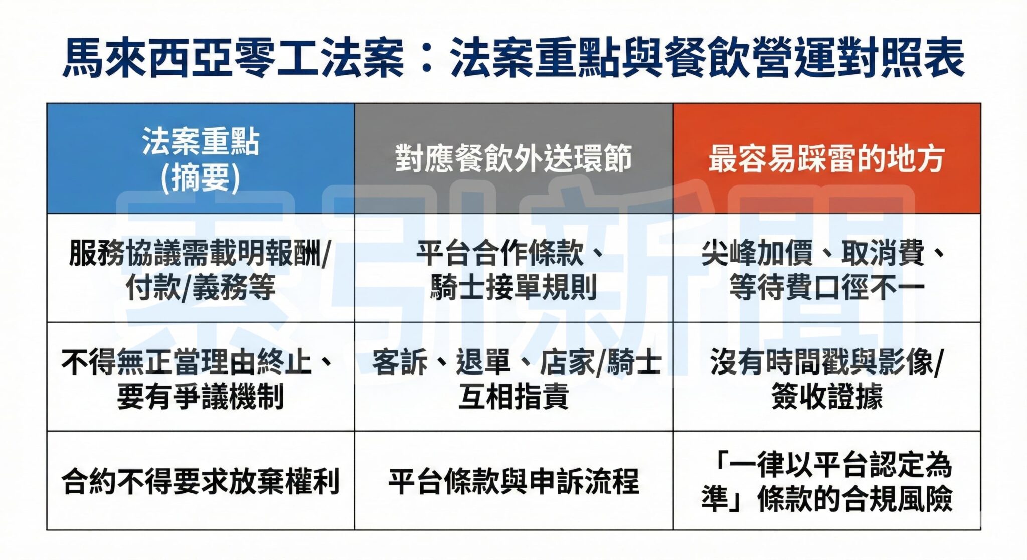 馬來西亞最新的《零工工作者法案2025》(Gig Workers Bill 2025)以「把規則寫進合約、把爭議拉進制度」為核心,鎖定約120萬名以平台或接案方式工作的零工;對在馬國展店、靠外送衝晚餐尖峰的台商連鎖餐飲來說,短期不是外送費漲不漲,而是外送合作條款、申訴停權流程、到店取餐SLA都可能被重新檢視——合規成本上升,但市場秩序也更可預期。